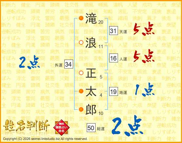 滝(20画)浪(11画) 正(5画)太(4画)郎(10画)