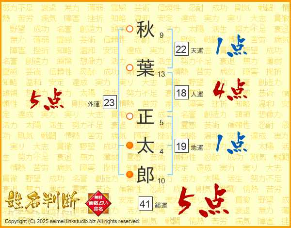 秋(9画)葉(13画) 正(5画)太(4画)郎(10画)