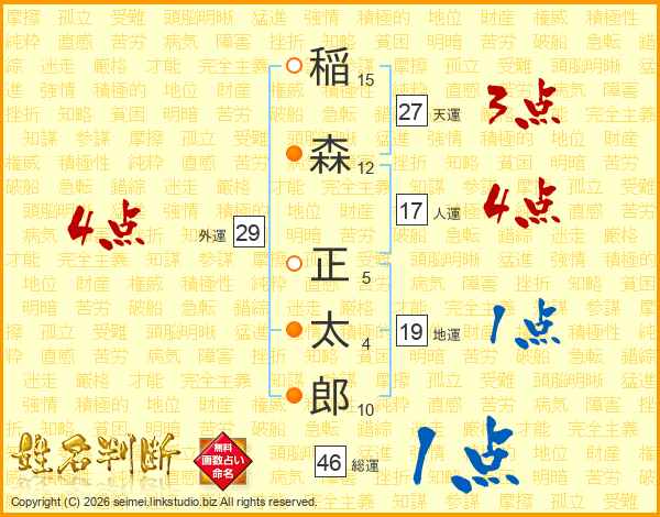 稲(15画)森(12画) 正(5画)太(4画)郎(10画)