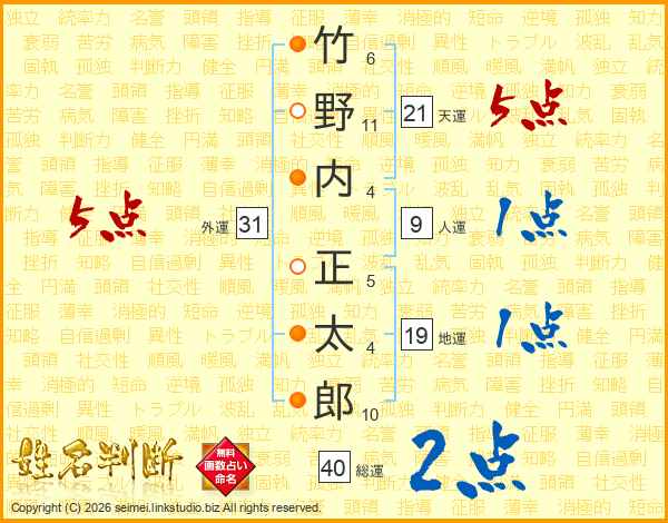 竹(6画)野(11画)内(4画) 正(5画)太(4画)郎(10画)