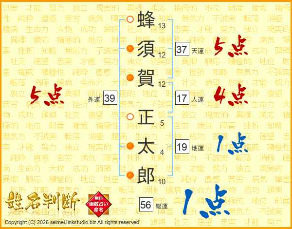 蜂(13画)須(12画)賀(12画) 正(5画)太(4画)郎(10画)