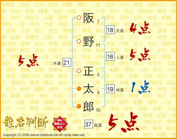 阪野正太郎さんの総運は37画の5点!