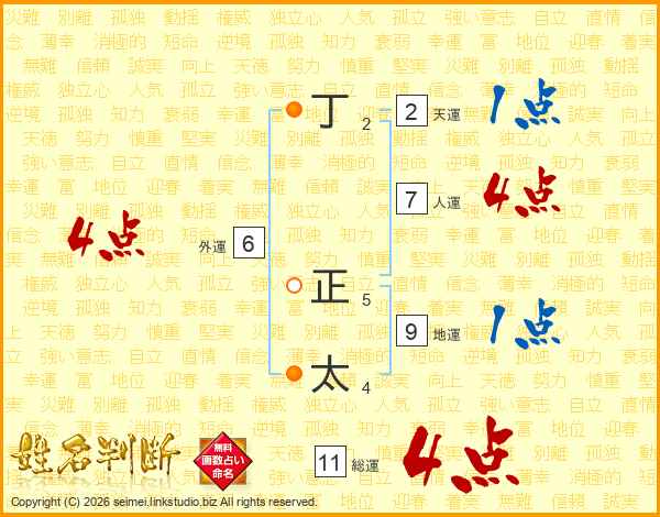 あなたの人生を表す1番重要な運勢です。生涯を通じて影響する総合運となり、主に50歳以降の晩年期に影響を及ぼします。苗字と名前の合計画数。
