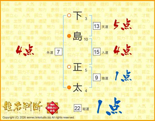 あなたの人生を表す1番重要な運勢です。生涯を通じて影響する総合運となり、主に50歳以降の晩年期に影響を及ぼします。苗字と名前の合計画数。