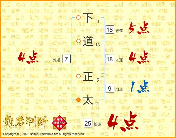 あなたの人生を表す1番重要な運勢です。生涯を通じて影響する総合運となり、主に50歳以降の晩年期に影響を及ぼします。苗字と名前の合計画数。