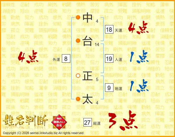 あなたの人生を表す1番重要な運勢です。生涯を通じて影響する総合運となり、主に50歳以降の晩年期に影響を及ぼします。苗字と名前の合計画数。