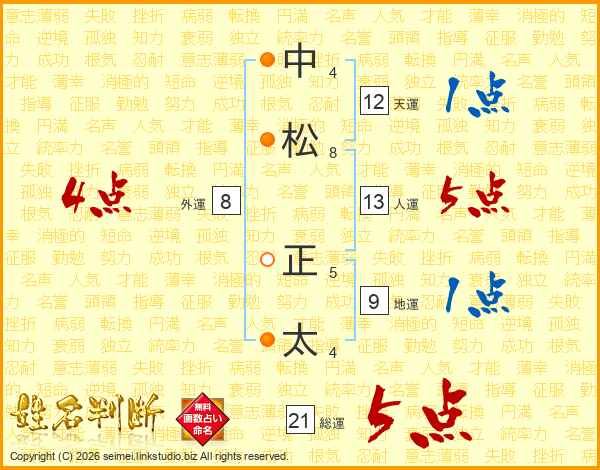 生活面を象徴する運勢です。外部から受ける影響力を表し、結婚運、家庭運や職場、環境への順応性を表します。総運から人運を引いた画数。姓や名が1文字の場合を除く。