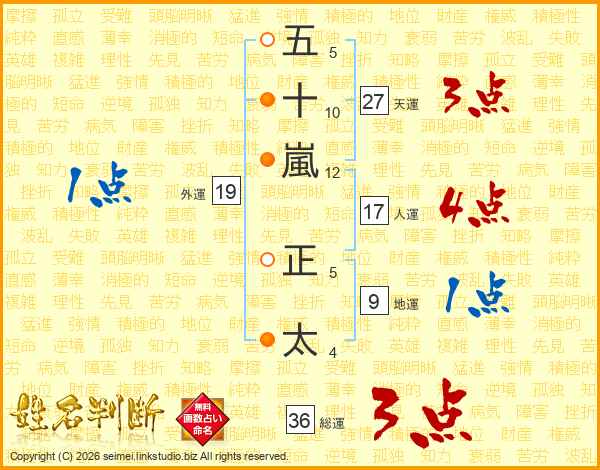 五(5画)十(10画)嵐(12画) 正(5画)太(4画)