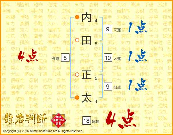 生活面を象徴する運勢です。外部から受ける影響力を表し、結婚運、家庭運や職場、環境への順応性を表します。総運から人運を引いた画数。姓や名が1文字の場合を除く。