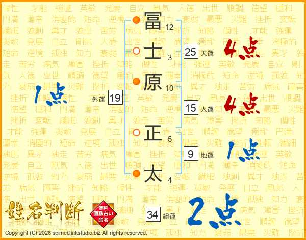 冨(12画)士(3画)原(10画) 正(5画)太(4画)