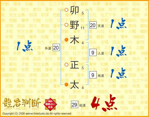 卯(5画)野(11画)木(4画) 正(5画)太(4画)