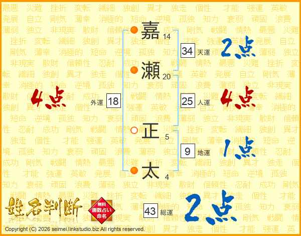 嘉(14画)瀬(20画) 正(5画)太(4画)