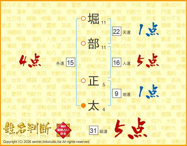 生活面を象徴する運勢です。外部から受ける影響力を表し、結婚運、家庭運や職場、環境への順応性を表します。総運から人運を引いた画数。姓や名が1文字の場合を除く。