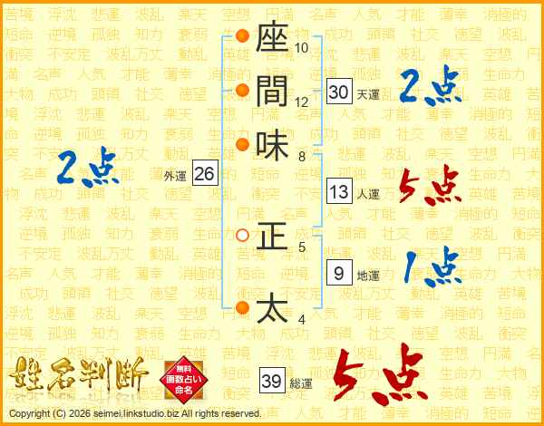座(10画)間(12画)味(8画) 正(5画)太(4画)