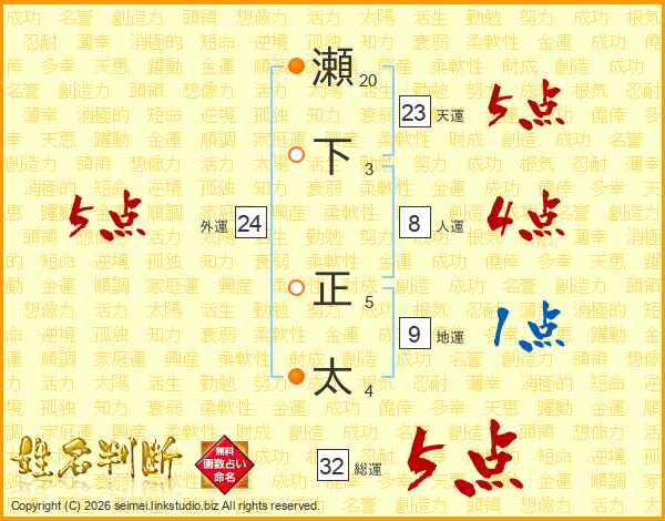 瀬下正太さんの総運は32画の5点!