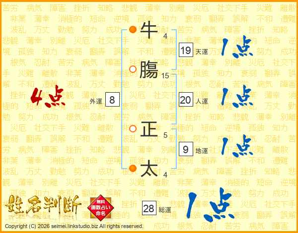 画数の奇数(○陽)と偶数(●陰)の配列で吉凶を占います。どちらかにかたよる名前は大凶名で避ける必要があります。画数の奇数偶数。