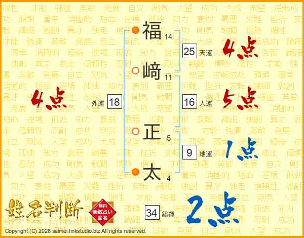 あなたの人生を表す1番重要な運勢です。生涯を通じて影響する総合運となり、主に50歳以降の晩年期に影響を及ぼします。苗字と名前の合計画数。