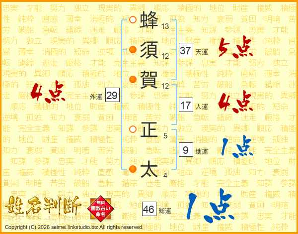 蜂(13画)須(12画)賀(12画) 正(5画)太(4画)