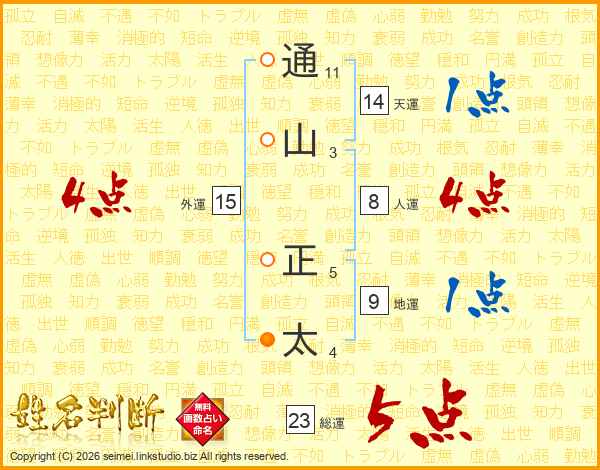 あなたの人生を表す1番重要な運勢です。生涯を通じて影響する総合運となり、主に50歳以降の晩年期に影響を及ぼします。苗字と名前の合計画数。
