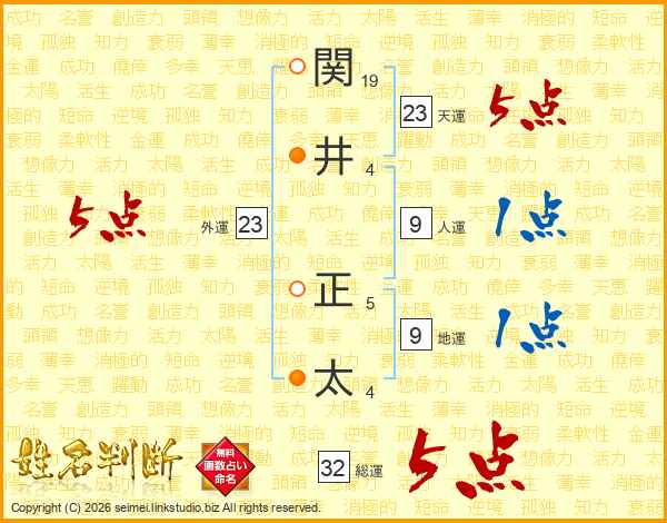 生活面を象徴する運勢です。外部から受ける影響力を表し、結婚運、家庭運や職場、環境への順応性を表します。総運から人運を引いた画数。姓や名が1文字の場合を除く。