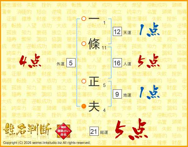 一條正夫さんの総運は21画の5点!