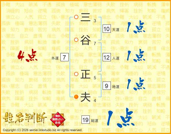 生活面を象徴する運勢です。外部から受ける影響力を表し、結婚運、家庭運や職場、環境への順応性を表します。総運から人運を引いた画数。姓や名が1文字の場合を除く。