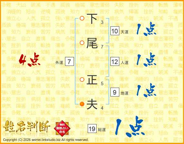 生活面を象徴する運勢です。外部から受ける影響力を表し、結婚運、家庭運や職場、環境への順応性を表します。総運から人運を引いた画数。姓や名が1文字の場合を除く。