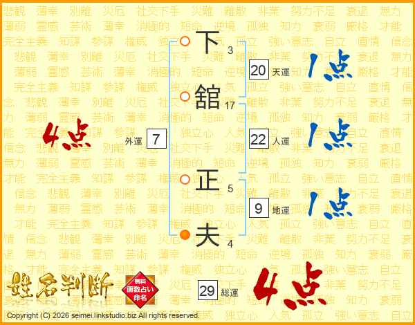 生活面を象徴する運勢です。外部から受ける影響力を表し、結婚運、家庭運や職場、環境への順応性を表します。総運から人運を引いた画数。姓や名が1文字の場合を除く。