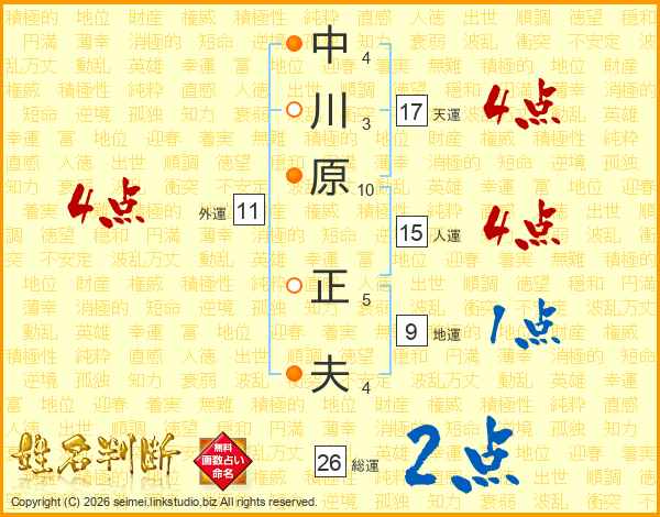 中(4画)川(3画)原(10画) 正(5画)夫(4画)