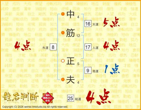 あなたの人生を表す1番重要な運勢です。生涯を通じて影響する総合運となり、主に50歳以降の晩年期に影響を及ぼします。苗字と名前の合計画数。