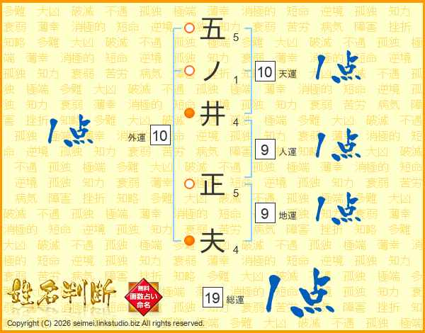 五(5画)ノ(1画)井(4画) 正(5画)夫(4画)