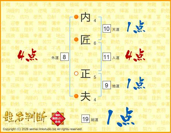 生活面を象徴する運勢です。外部から受ける影響力を表し、結婚運、家庭運や職場、環境への順応性を表します。総運から人運を引いた画数。姓や名が1文字の場合を除く。