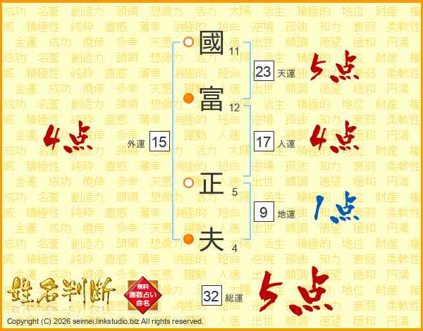 あなたの人生を表す1番重要な運勢です。生涯を通じて影響する総合運となり、主に50歳以降の晩年期に影響を及ぼします。苗字と名前の合計画数。