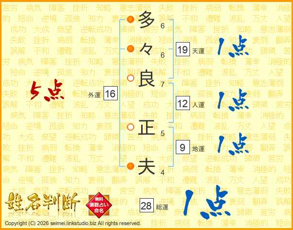 多(6画)々(6画)良(7画) 正(5画)夫(4画)