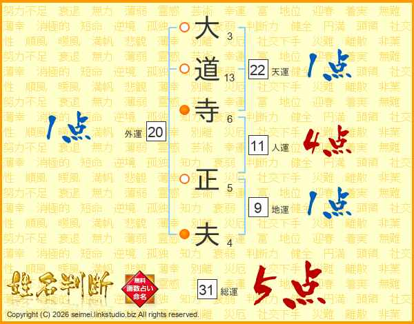 大(3画)道(13画)寺(6画) 正(5画)夫(4画)