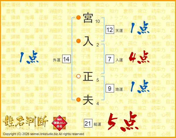 生活面を象徴する運勢です。外部から受ける影響力を表し、結婚運、家庭運や職場、環境への順応性を表します。総運から人運を引いた画数。姓や名が1文字の場合を除く。