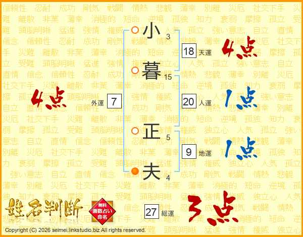 生活面を象徴する運勢です。外部から受ける影響力を表し、結婚運、家庭運や職場、環境への順応性を表します。総運から人運を引いた画数。姓や名が1文字の場合を除く。