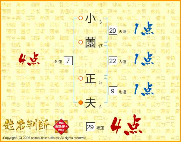 生活面を象徴する運勢です。外部から受ける影響力を表し、結婚運、家庭運や職場、環境への順応性を表します。総運から人運を引いた画数。姓や名が1文字の場合を除く。