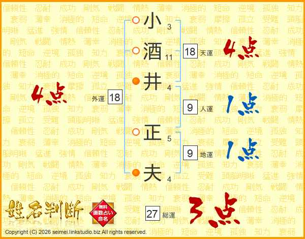 小(3画)酒(11画)井(4画) 正(5画)夫(4画)