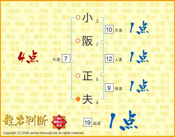 生活面を象徴する運勢です。外部から受ける影響力を表し、結婚運、家庭運や職場、環境への順応性を表します。総運から人運を引いた画数。姓や名が1文字の場合を除く。