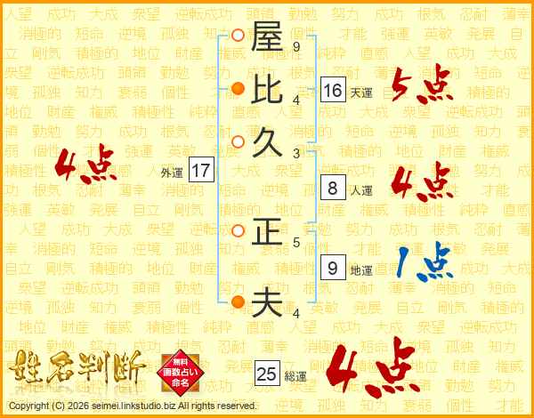 屋(9画)比(4画)久(3画) 正(5画)夫(4画)
