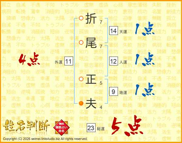 あなたの人生を表す1番重要な運勢です。生涯を通じて影響する総合運となり、主に50歳以降の晩年期に影響を及ぼします。苗字と名前の合計画数。