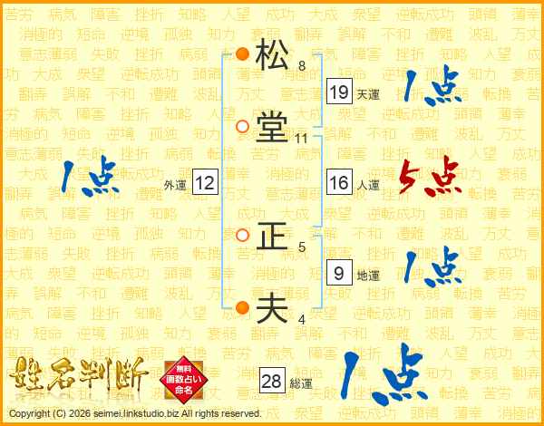 あなたの人生を表す1番重要な運勢です。生涯を通じて影響する総合運となり、主に50歳以降の晩年期に影響を及ぼします。苗字と名前の合計画数。
