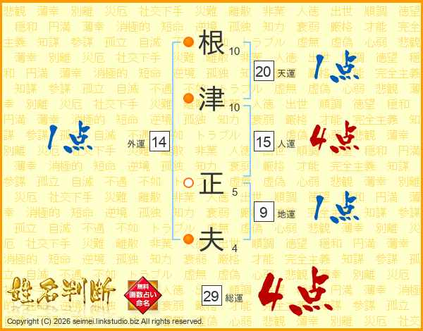 根(10画)津(10画) 正(5画)夫(4画)