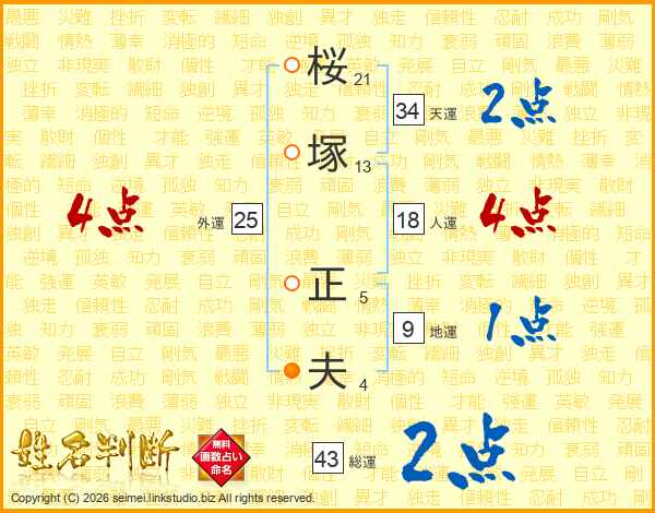 桜(21画)塚(13画) 正(5画)夫(4画)