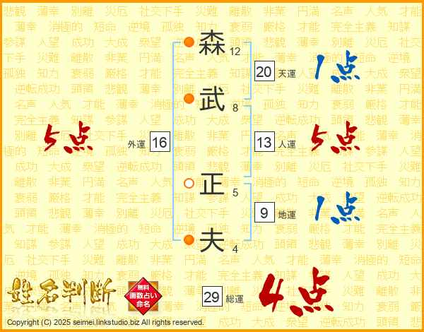 あなたの人生を表す1番重要な運勢です。生涯を通じて影響する総合運となり、主に50歳以降の晩年期に影響を及ぼします。苗字と名前の合計画数。