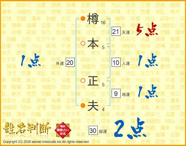 あなたの人生を表す1番重要な運勢です。生涯を通じて影響する総合運となり、主に50歳以降の晩年期に影響を及ぼします。苗字と名前の合計画数。