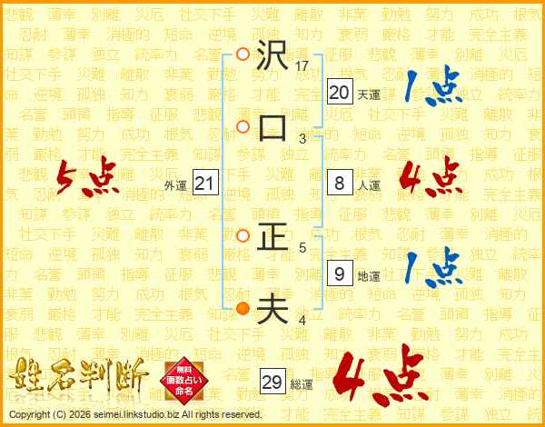生活面を象徴する運勢です。外部から受ける影響力を表し、結婚運、家庭運や職場、環境への順応性を表します。総運から人運を引いた画数。姓や名が1文字の場合を除く。