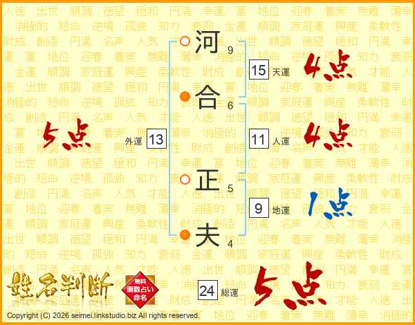 生活面を象徴する運勢です。外部から受ける影響力を表し、結婚運、家庭運や職場、環境への順応性を表します。総運から人運を引いた画数。姓や名が1文字の場合を除く。