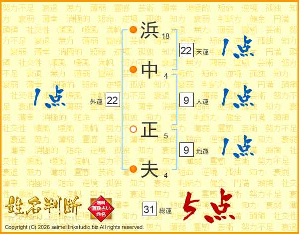 あなたの人生を表す1番重要な運勢です。生涯を通じて影響する総合運となり、主に50歳以降の晩年期に影響を及ぼします。苗字と名前の合計画数。